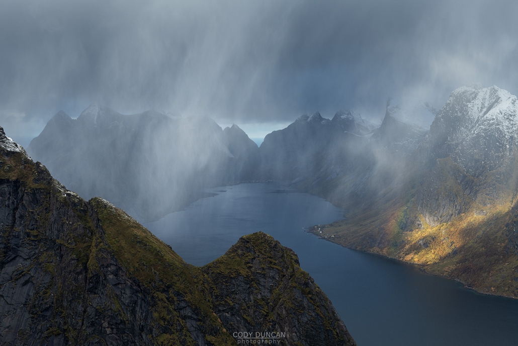 Photo: October snow flurries over Kirkefjord from Reinebringen, Moskenesøy, Lofoten Islands, Norway. October 7, 2018. 10:41