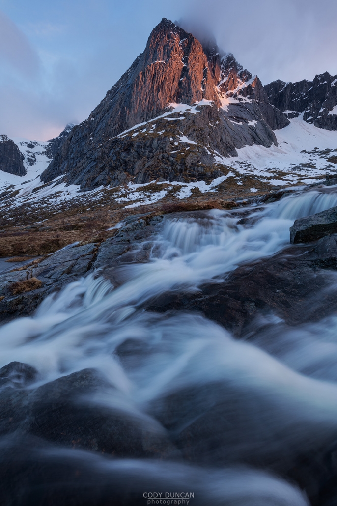 The mountain snow combined with the sun and warm temperatures quickly set the spring thaw into motion. All over Lofoten the often quiet little streams were flowing high and fast. Driving by this location on my way to somewhere else I noticed the river flowing across a section of rocks that for whatever reason I’ve never photographed before – I usually only visit the lower waterfalls here.