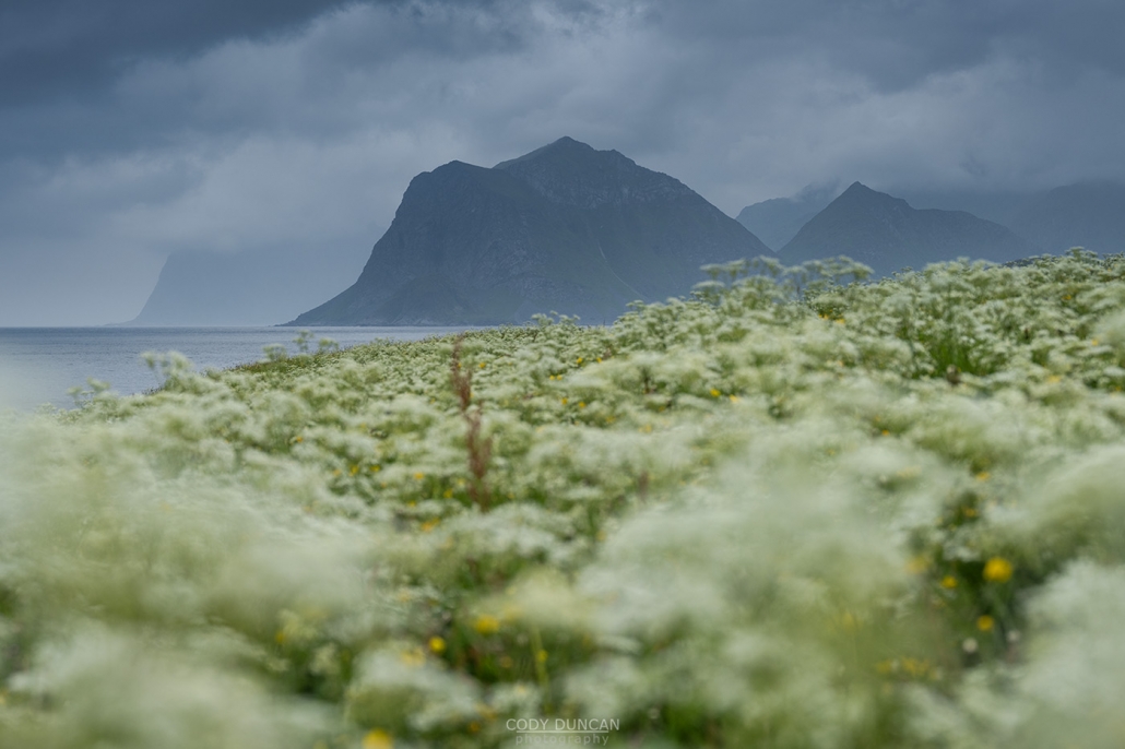 Photo: The look of early summer: wildflowers and rain, Flakstadøy, Lofoten Islands, Norway. June 24, 2021. 15:57