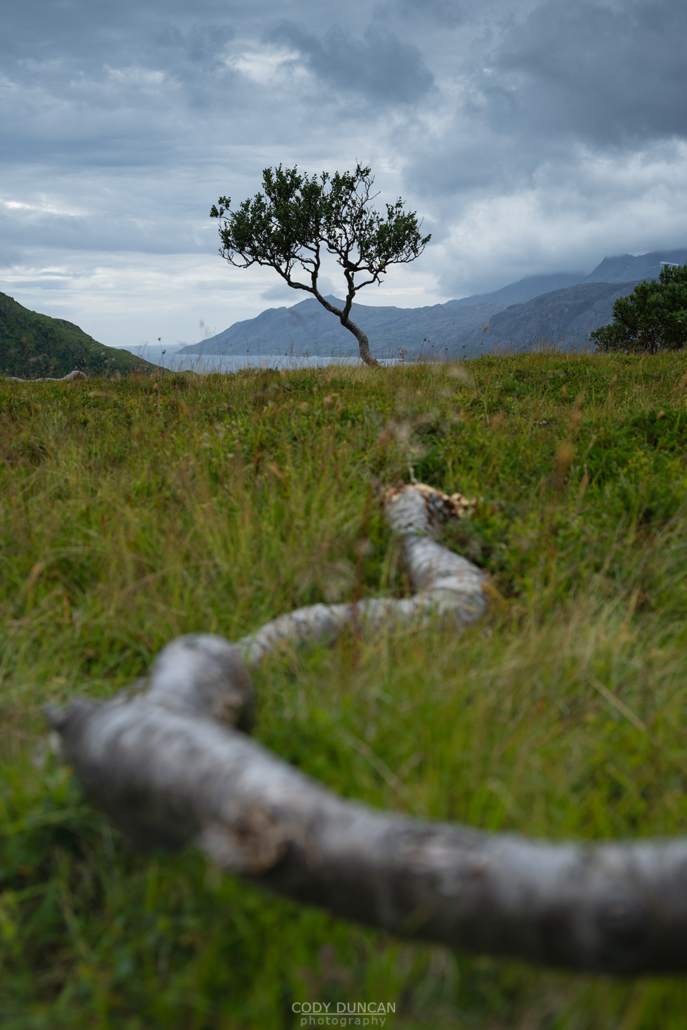 This tree here used to be part of one of my favourite compositions in the area – see Friday Photo #408. Unfortunately, the tree you see lying in the foreground also used to be part of the composition, but has since fallen in one of Lofoten’s many winter storms. It is a windy place up there along the ridgeline, which is what makes the trees what they are.