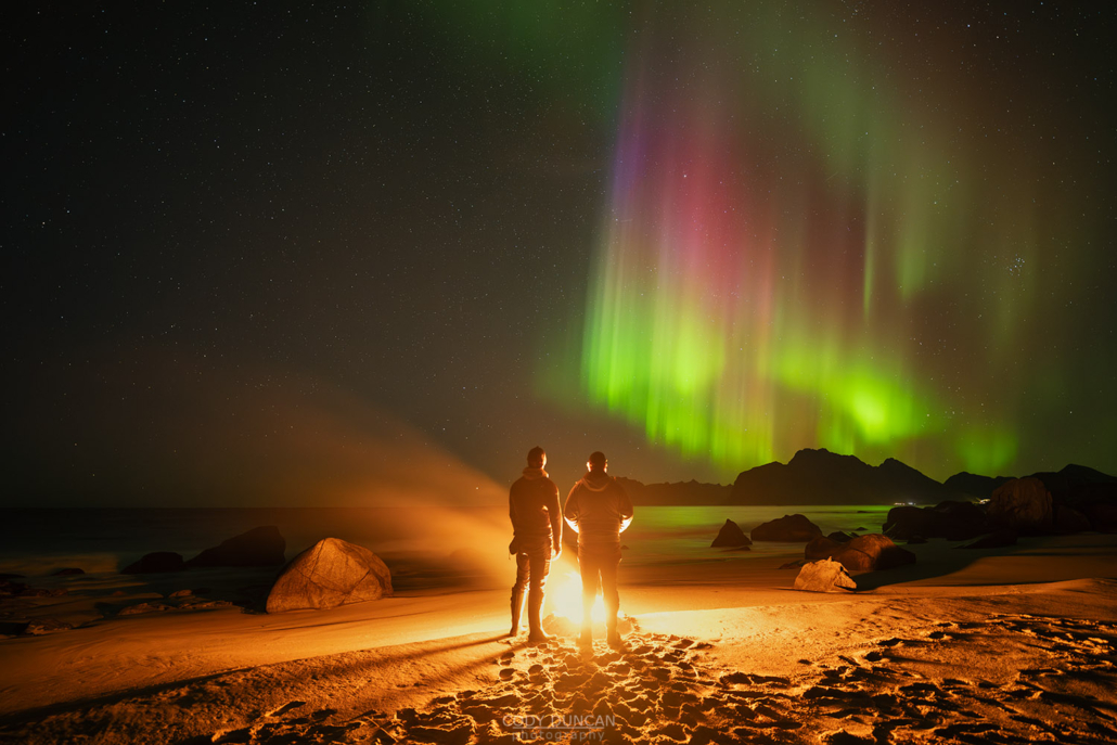And so we did out best to stand still as statues for the several second exposures, running back to check the cameras, and then try again. Once the aurora increased in intensity we put out the fire and shot the beach as normal. But I think these campfire images are more interesting, at least for my familiar location.