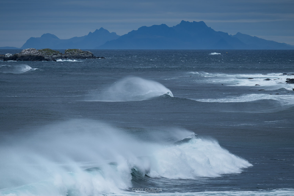 Here, I had a higher vantage point, and also a better background – the dark mountains of Vesterålen, some 50km away.