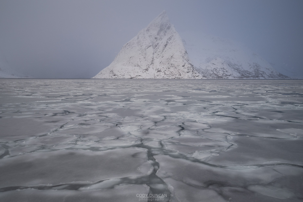 I had already shot several different compositions, including the edge of the foreground before eventually wandering closer to this nice little crack through the ice to use as a leading line towards Osltind. By now the snow was beginning to fall again and the mountain was slowly disappearing until it eventually faded away for good.