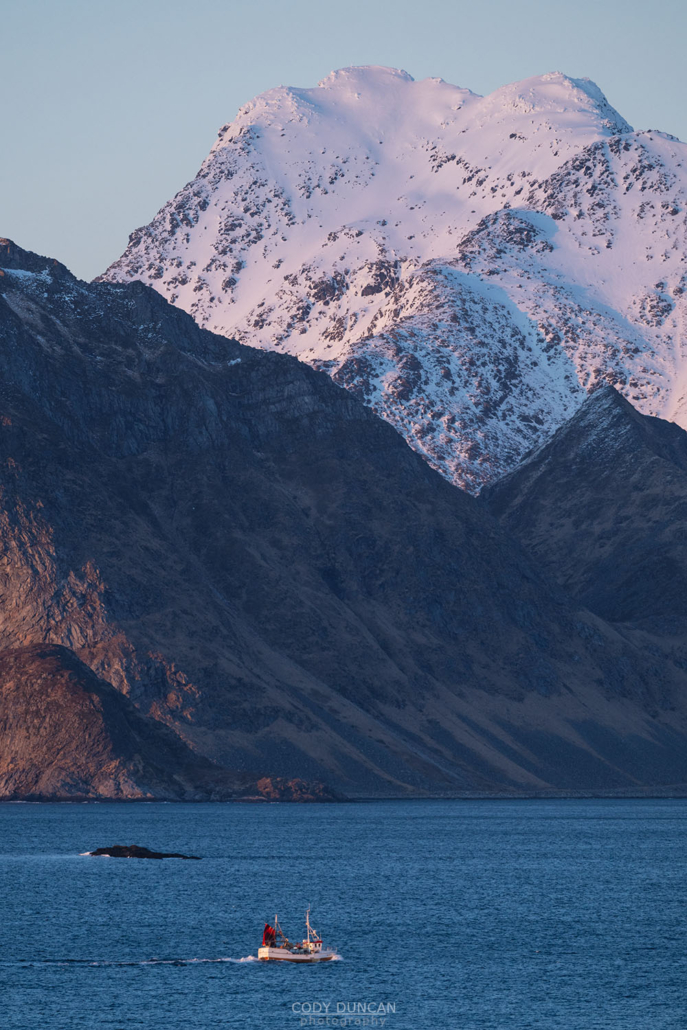 Photo: Fishing boat heading through Nappstraumen with Himmeltindan rising in the distance, Flakstadøy, Lofoten Islands, Norway. April 5, 2026. 20:05