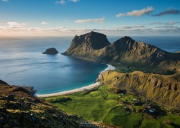 Photo: View of Vik and Haukland beaches from the summit of Hollandsmelen, Vestvågøy, Lofoten Islands, Norway. September 2013